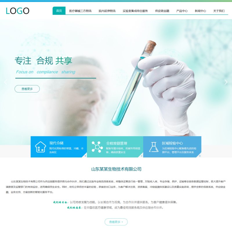 页面简约大气,以蓝绿色搭配更加突出医疗行业。首页主要侧重于产品特色,整体运用组件、容器等功能展现,塑造了专业性及稳定的企业形象。