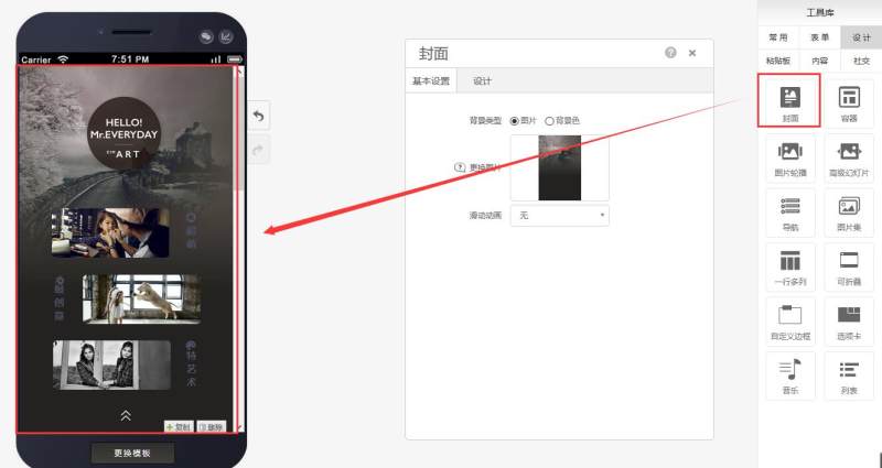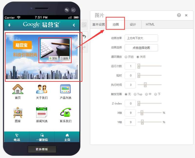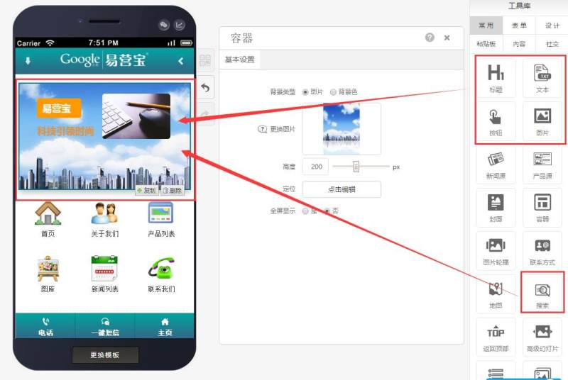 Step 3: You can drag in titles, buttons, text, images, and search controls within the container, and add animation effects to these controls, as shown below:
