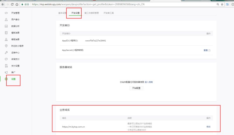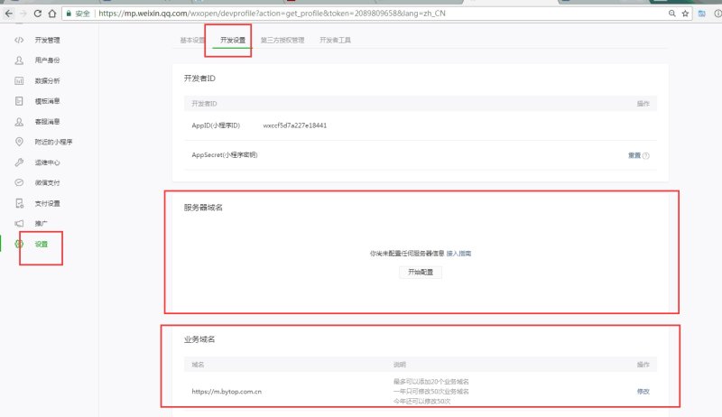 After registering the mini-program, you need to log in to the mini-program backend to bind the server domain name and business domain name.