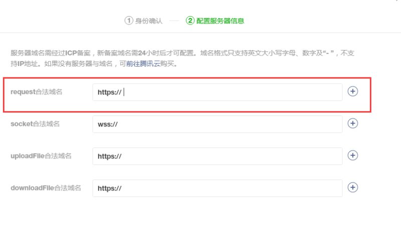 After enabling the server domain name configuration, you only need to configure the request legal domain name and fill in the mini-program domain name.