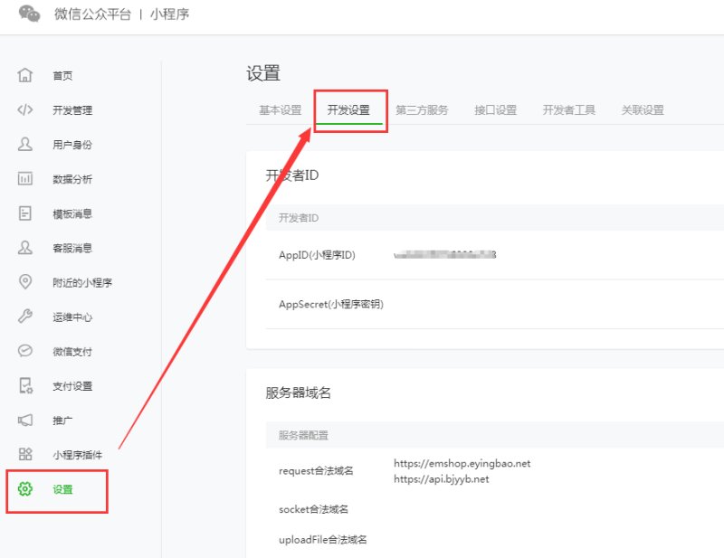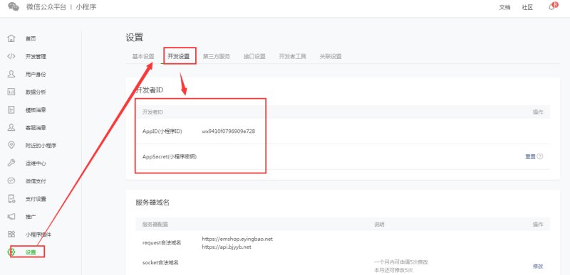 5. In Development Settings, view the AppID (Mini Program ID) and AppSecret (Mini Program Secret Key).