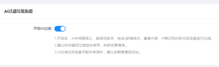 L'IA analyse et identifie les demandes de renseignements indésirables selon plusieurs critères. Une fois une demande identifiée comme indésirable, le système la filtre et la marque automatiquement, vous assurant que chaque demande que vous voyez dans le back-office a été présélectionnée comme une demande de renseignement à fort potentiel. Cette mise à niveau peut vous faire économiser plus de 50 % du temps consacré au suivi inefficace, vous permettant de concentrer vos efforts sur les clients réellement susceptibles de conclure une transaction.