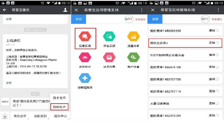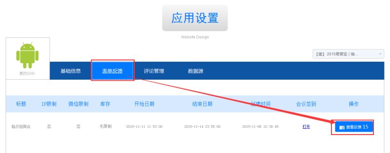 在应用列表里,点击“设置”——“表单反馈”里查看;也可以关注公众号“易营宝服务”,在“服务中心——我的账号”里登录你的易营宝账号和密码,在信息反馈力查看。