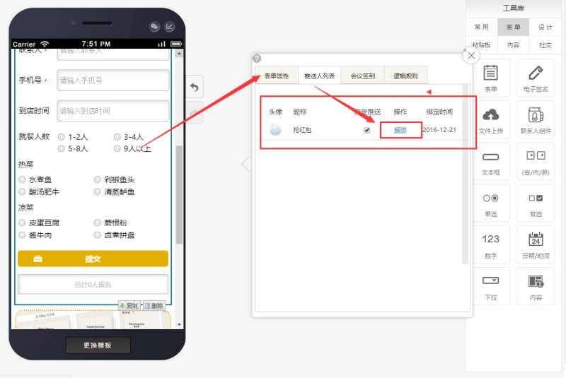 绑定表单的微信用户会在推送人列表中显示,点击解绑即可实现。