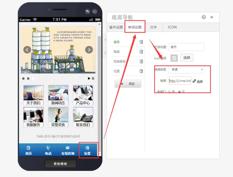 带底部快捷键的模板(如ET-00028),位置或地图键,可设置普通链接,链接到百度地图的URL即可。