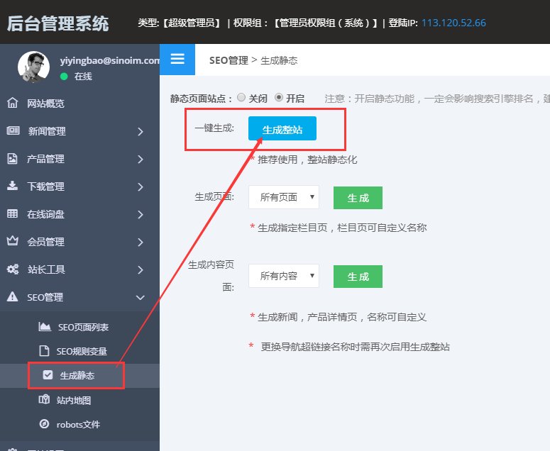 》》②进入管理后台后,点击SEO管理-生成静态-生成整站