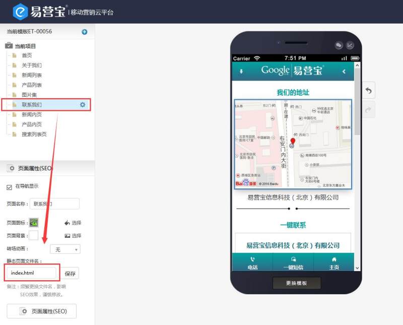 二是网站上线后,联系我们页面属性,静态文件名为:index.html,将首页的静态文件名改为:index.html,联系我们改为其他的