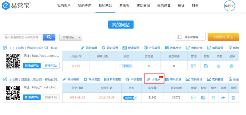 1, 已上线网站,在“我的网站”列表里,点击“小程序”