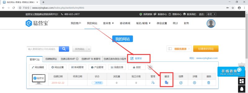 1、在“我的网站”列表里,点击网站“翻译”按钮:
